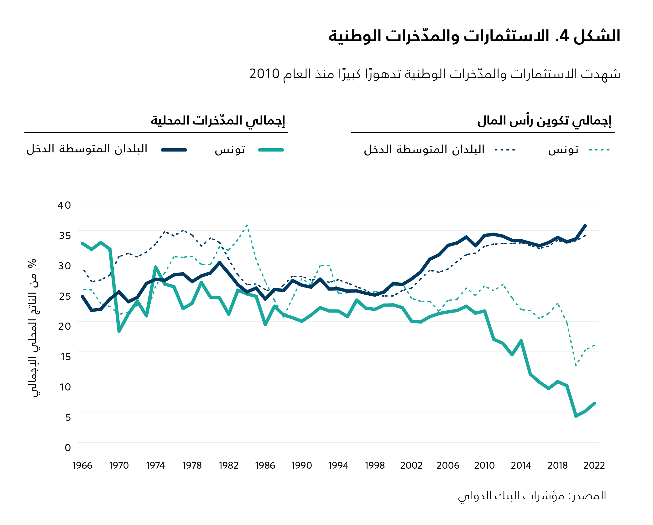 يُشار إلى أن خفض الدين المحلي، الذي يمثّل نسبة 40 في المئة من إجمالي الدين العام، قد يتيح حيّزًا ماليًا. ويمكن تحقيق ذلك من خلال إجراءات "القمع المالي"، أي تحديد أسعار فائدة أدنى من معدلات التضخم (جعل معدلات الفائدة سلبية)على الدين المحلي.ويمكن تحقيق ذلك أيضًا من خلال إعادة جدولة الدين المحلي من دون التفاوض مع الدائنين، ما من شأنه نقل عبء الدين إلى عاتق المستثمرين المحليين الذين لن يكون أمامهم من خيار سوى القبول، نظرًا إلى أن القيود القانونية ستحدّ من خروج رؤوس الأموال من تونس. لكن إجراءات القمع المالي قد تُضعِف النظام المصرفي وتفاقم حالة فقدان الثقة بين السلطات والنخب المالية. تكمن المشكلة في أن المدّخرات الوطنية منخفضة أساسًا (انظر الشكل 4)، ويُحتمل أن تتضاءل أكثر على وقع اتّساع فجوة انعدام الثقة.